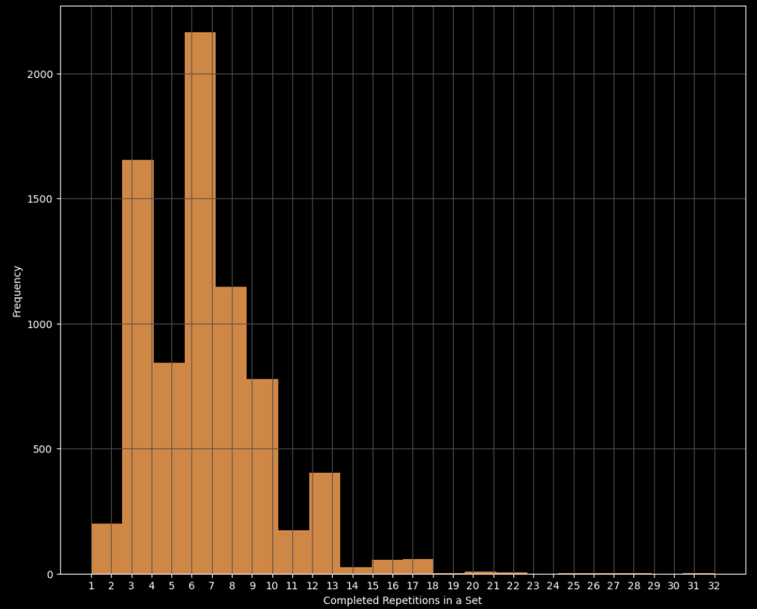 This gave us a training set of 50,767 reps, and a holdout test set of 5,639 reps to evaluate our model. Below is a histogram of the number of reps users performed per set before failing: