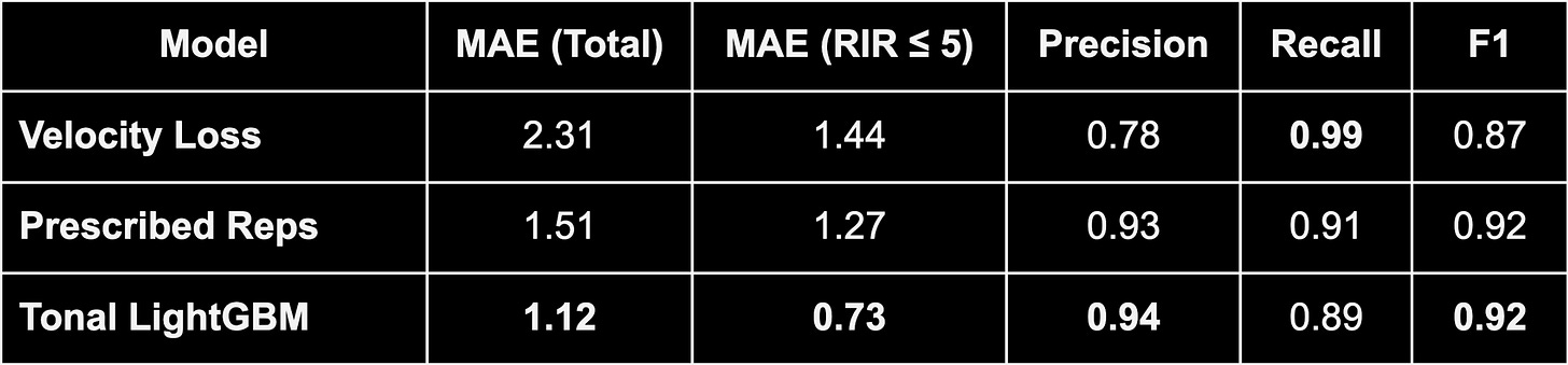 Tonal’s LightGBM model significantly outperformed the standard Velocity Loss and Baseline Prescribed Reps models. Of particular note is the excellent performance in the Mean Average Error when RIR ≤ 5. It matched expert human estimators with years of experience resistance training. The precision, recall, and f1 columns are based on the binary classification task of correctly identifying when RIR ≤ 5, i.e. identifying effective reps, which it did very effectively. We believe the VL model demonstrated poor accuracy with our users because the main assumption that they are imparting maximum effort during every repetition they perform is almost certainly not true.